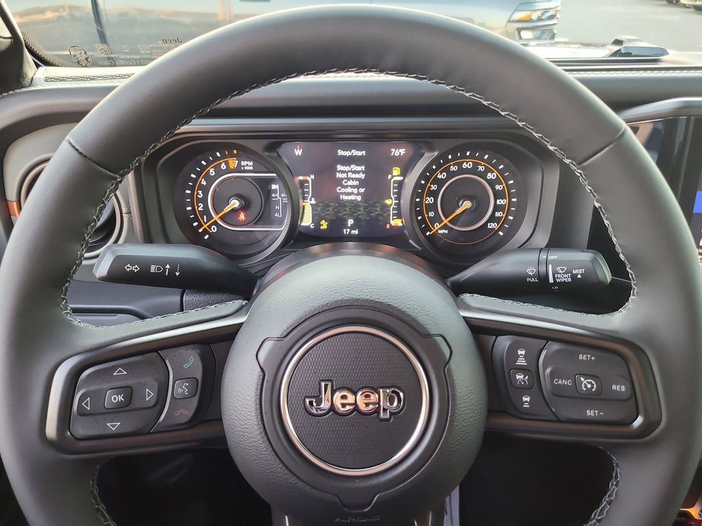 Quick Order Package 24A Mojave X (Alpine Premium Audio System, Auto High Beam Headlamp Control, Auto-Dimming Rear-View Mirror, Blind Spot & Cross Path Detection, Bluetooth Wireless Speaker, Body Color 3-Piece Hard Top, Body Color Rubicon Highline Flare, Freedom Panel Storage Bag, Full Length Floor Console Premium Armrest, Heated Front Seats, Heated Steering Wheel, Integrated Off-Road Camera, Integrated Voice Command w/Bluetooth, Leather Trimmed Bucket Seats, Leather Wrapped Park Brake Handle, Leather Wrapped Shift Knob, Mojave Top Hood Decal, MOPAR Hardtop Headliner, ParkSense Rear Park Assist System, Power 4-Way Driver Lumbar Adjust, Power 4-Way Passenger Lumbar Adjust, Power Adjust 8-Way Driver Seat, Power Adjust 8-Way Front Passenger Seat, Premium Door Trim Panel, Radio: Uconnect 5 Nav w/12.3" Display, Rear Armrest w/Cupholder Seat, Rear Sliding Window, Rear Window Defroster, Steel Front Bumper, Steel Rear Bumper, Universal Garage Door Opener, and USB Host Flip), 4-Wheel Disc Brakes, 4.10 Rear Axle Ratio, 8 Speakers, ABS brakes, Air Conditioning, Alloy wheels, AM/FM radio: SiriusXM with 360L, Apple CarPlay/Android Auto, Automatic temperature control, Brake assist, Compass, Delay-off headlights, Driver door bin, Driver vanity mirror, Dual front impact airbags, Dual front side impact airbags, Electronic Stability Control, Emergency communication system: Jeep Connect, Front anti-roll bar, Front Bucket Seats, Front Center Armrest w/Storage, Front dual zone A/C, Front fog lights, Front reading lights, Fully automatic headlights, Heated door mirrors, Heavy Duty Suspension w/Gas Shocks, Illuminated entry, Integrated roll-over protection, Low tire pressure warning, Manufacturer's Statement of Origin, MOPAR All-Weather Slush Mats, Mopar Bright Door Sills, MOPAR Doors Off Mirror Kit, MOPAR Hard Tri-Fold Tonneau Cover, MOPAR Spray In Bedliner, Occupant sensing airbag, Outside temperature display, Overhead airbag, Panic alarm, Passenger door bin, Passenger vanity mirror, Power door mirrors, Power steering, Power windows, Premium Cloth Seats w/Sport Bolsters, Radio data system, Radio: Uconnect 5 w/12.3" Display, Rear anti-roll bar, Rear reading lights, Remote keyless entry, Security system, Speed control, Split folding rear seat, Steering wheel mounted audio controls, Tachometer, Telescoping steering wheel, Tilt steering wheel, Traction control, Trip computer, Variably intermittent wipers, Voltmeter, and Wheels: 17" x 7.5" Dark Gray Painted.