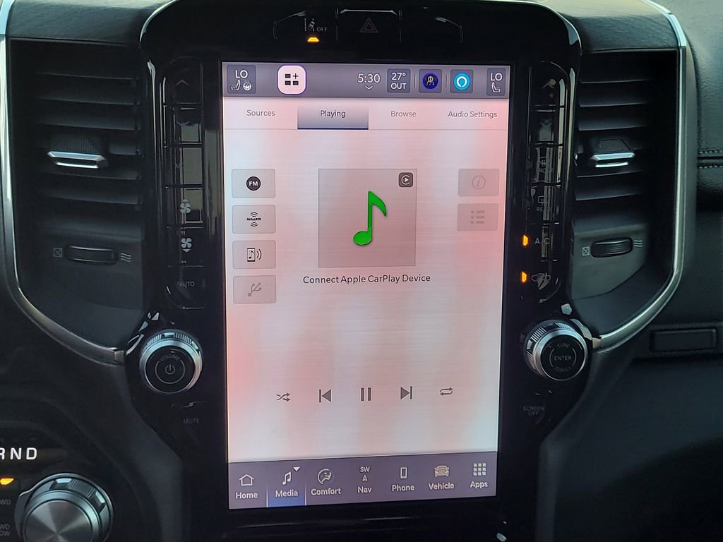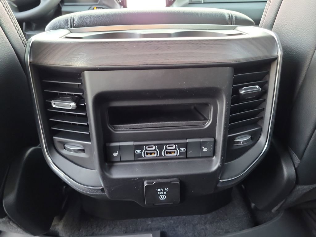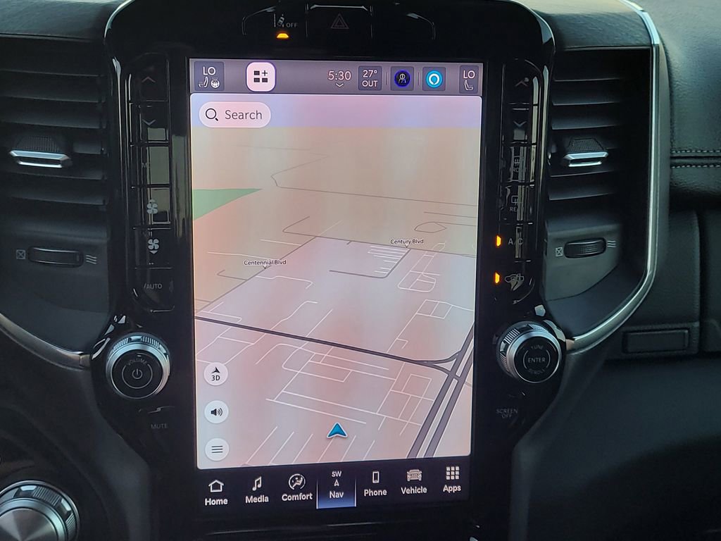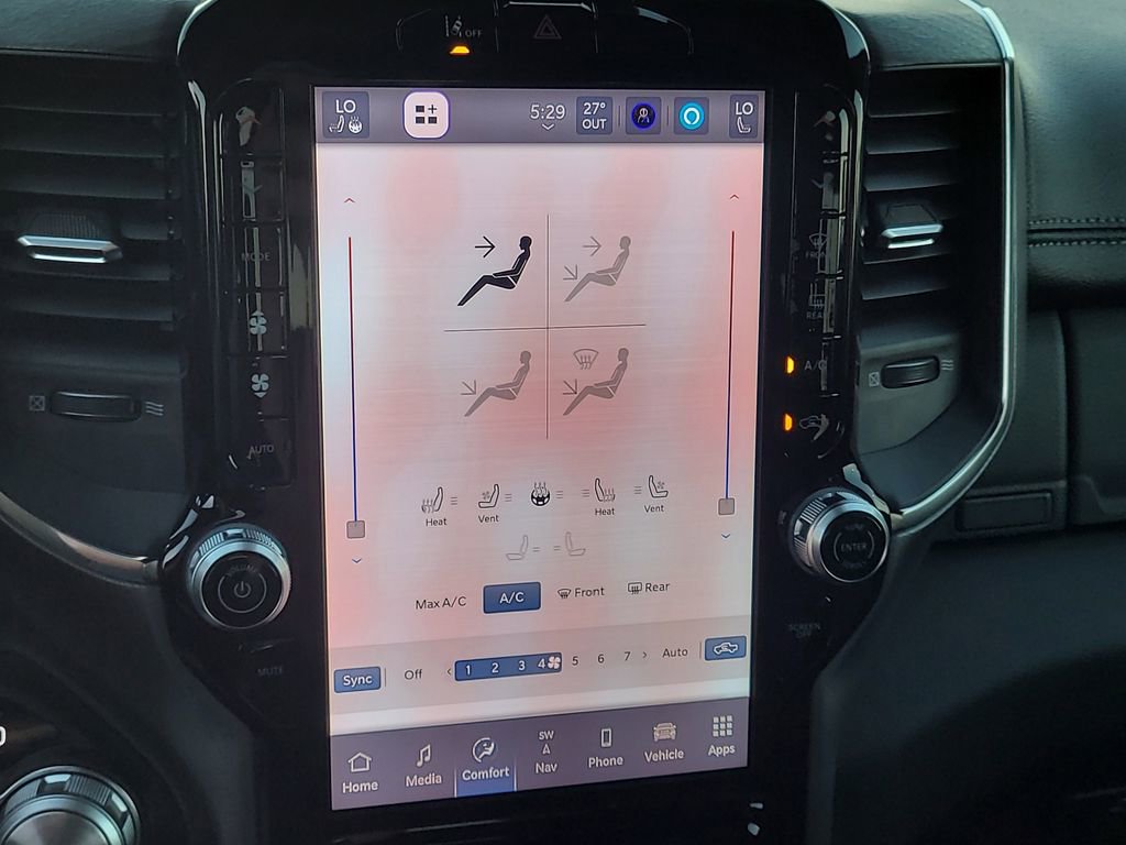 Laramie Level 1 Equipment Group (Rain Sensitive Windshield Wipers and Remote Tailgate Release), Quick Order Package 27H Laramie, Sport Appearance Package (Accent Color Premium Power Mirrors, Auto Power-Folding Mirrors, Auto-Dimming Exterior Driver Mirror, Black Interior Accents, Black Painted Exterior Mirrors Caps, Body Color Front Bumper, Body Color Rear Bumper w/Step Pads, Bridgestone Brand Tires, Convex Wide-Angle Exterior Mirror Insert, Exterior Mirrors Courtesy Lamps, Exterior Mirrors w/Heating Element, Exterior Mirrors w/Memory, Exterior Mirrors w/Supplemental Signals, Grille Surround 3 Body Color Tex 2 Black, RAM Grille Badge - Chrome, and Sport Performance Hood), 10 Speakers, 33 Gallon Fuel Tank, 4-Wheel Disc Brakes, 4G LTE Wi-Fi Hot Spot, ABS brakes, Active Noise Control System, Air Conditioning, Alloy wheels, AM/FM radio: SiriusXM with 360L, Anti-Spin Differential Rear Axle, Apple CarPlay/Android Auto, Audio memory, Auto High-beam Headlights, Auto-dimming door mirrors, Auto-dimming Rear-View mirror, Automatic temperature control, Brake assist, Bumpers: chrome, Chrome Exterior Mirrors, Compass, Connected Travel & Traffic Services, Connectivity - US/Canada, Delay-off headlights, Driver door bin, Driver vanity mirror, Dual front impact airbags, Dual front side impact airbags, Electronic Stability Control, Front anti-roll bar, Front Bucket Seats, Front Center Armrest w/Storage, Front dual zone A/C, Front fog lights, Front reading lights, Front wheel independent suspension, Fully automatic headlights, Garage door transmitter, GPS Navigation, Heated door mirrors, Heated front seats, Heated rear seats, Heated steering wheel, Illuminated entry, Integrated Center Stack Radio, Integrated Voice Command w/Bluetooth, Leather steering wheel, Leather Trimmed Bucket Seats, Low tire pressure warning, Memory seat, MOPAR Front & Rear Rubber Floor Mats, Navigation System, Occupant sensing airbag, Off-Road Information Pages, Outside temperature display, Overhead airbag, Overhead console, Panic alarm, ParkView Rear Back-Up Camera, Passenger door bin, Passenger vanity mirror, Power door mirrors, Power driver seat, Power passenger seat, Power steering, Power windows, Radio data system, Radio: Uconnect 5 Nav w/12.0" Display, Rear anti-roll bar, Rear reading lights, Rear seat center armrest, Rear step bumper, Remote keyless entry, Security system, SiriusXM Radio Service, SiriusXM w/360L, Speed control, Split folding rear seat, Steering wheel mounted audio controls, Tachometer, Telescoping steering wheel, Tilt steering wheel, Traction control, Trip computer, Turn signal indicator mirrors, USB Host Flip, Variably intermittent wipers, Ventilated front seats, Voltmeter, and Wheels: 20" x 9" Premium Paint/Polish.