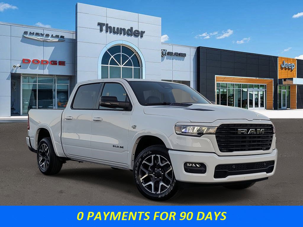 Factory MSRP: $70,825 Bright White Clearcoat Ram 1500 Laramie 4WD HEMI 5.7L V8 Multi Displacement VVT eTorque 8-Speed Automatic